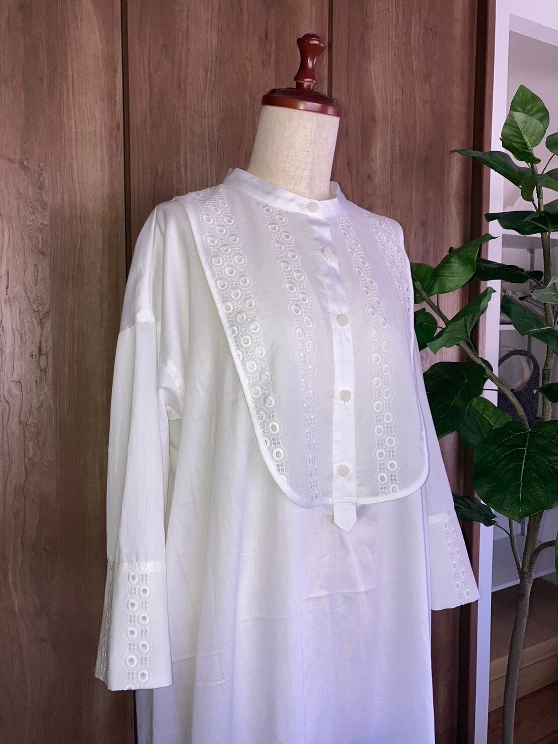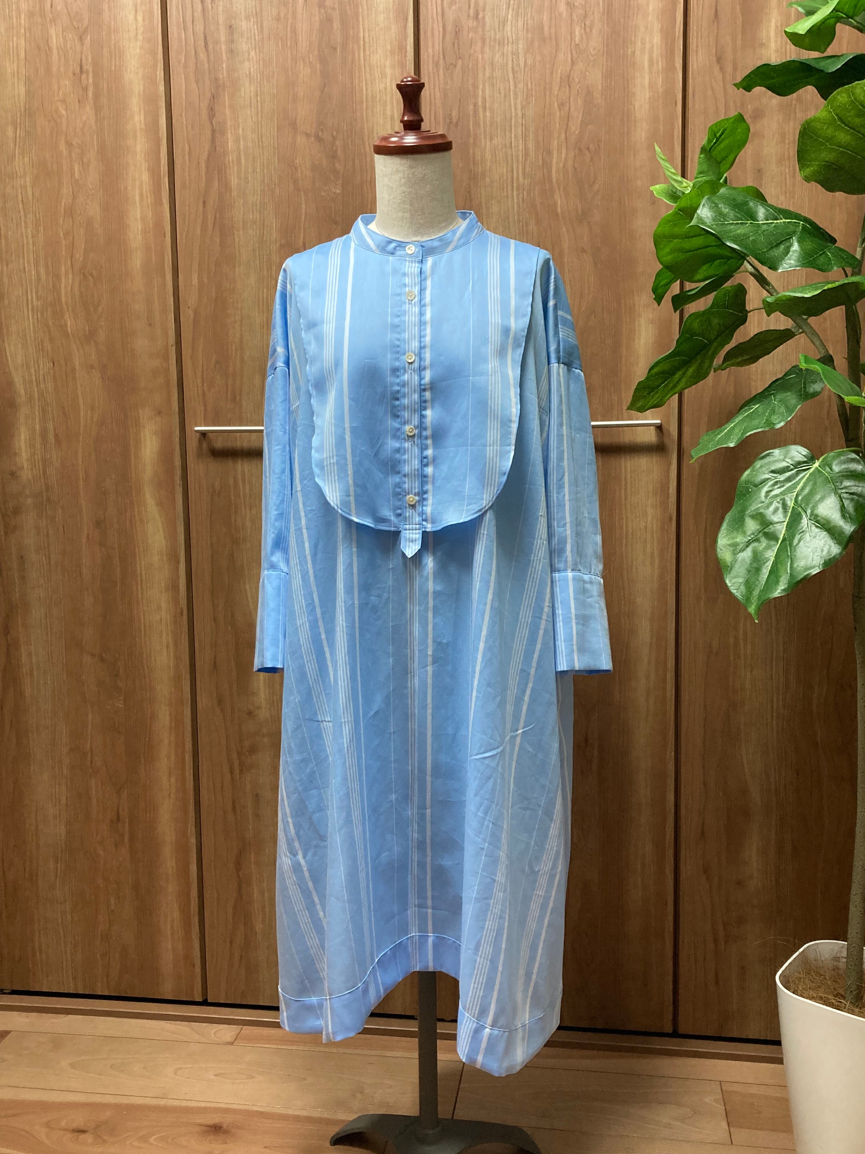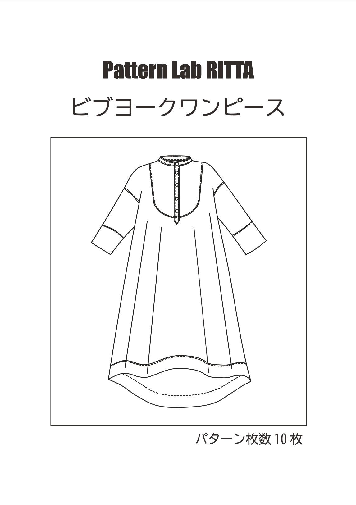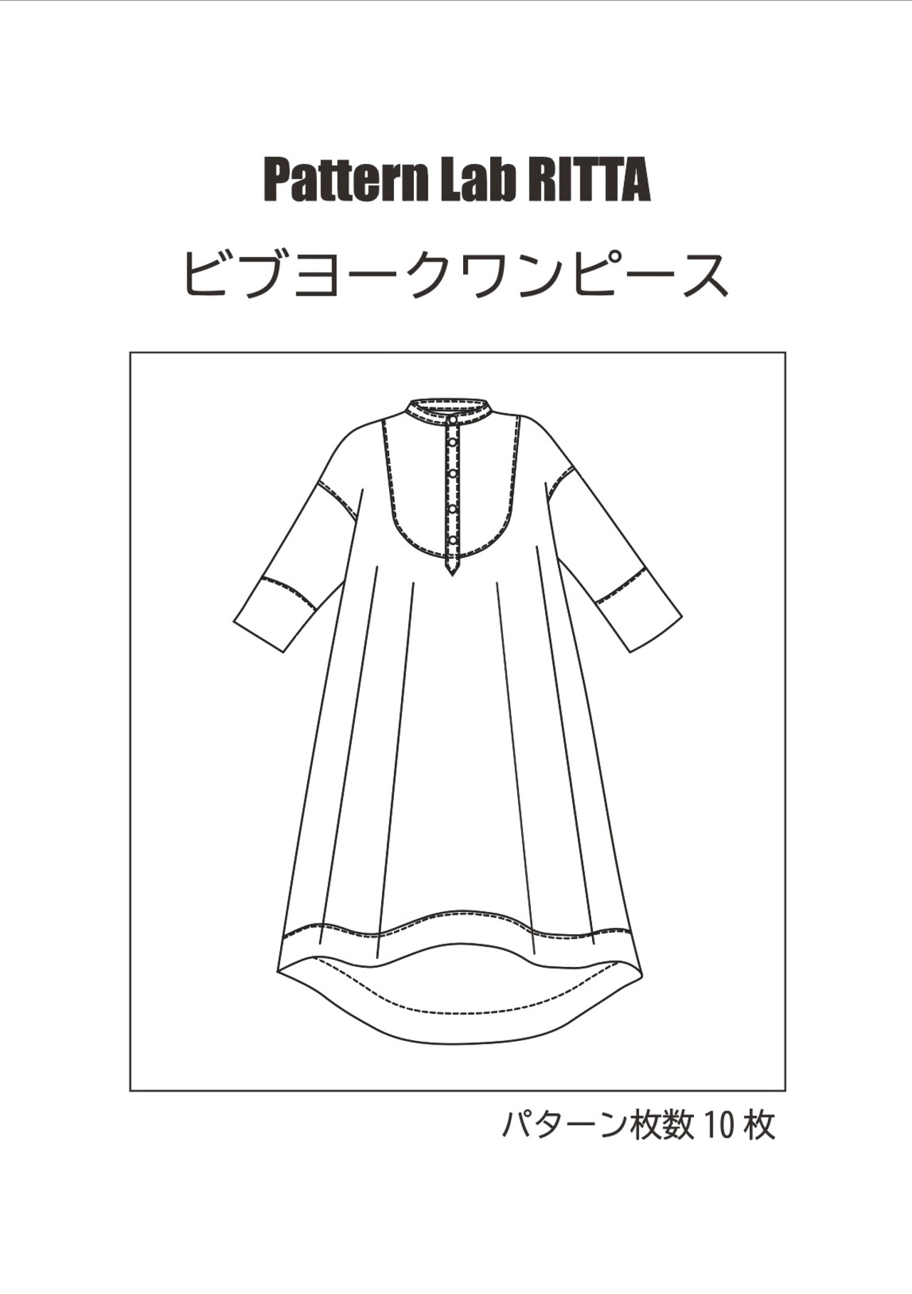 見本はストライプの柔らかい綿ローンで作っていますが、無地で作って短冊のボタンを凝った物にしてみたり、ビブヨーク、カフス、裾見返し部分の布地を変えて作るのもおすすめです。