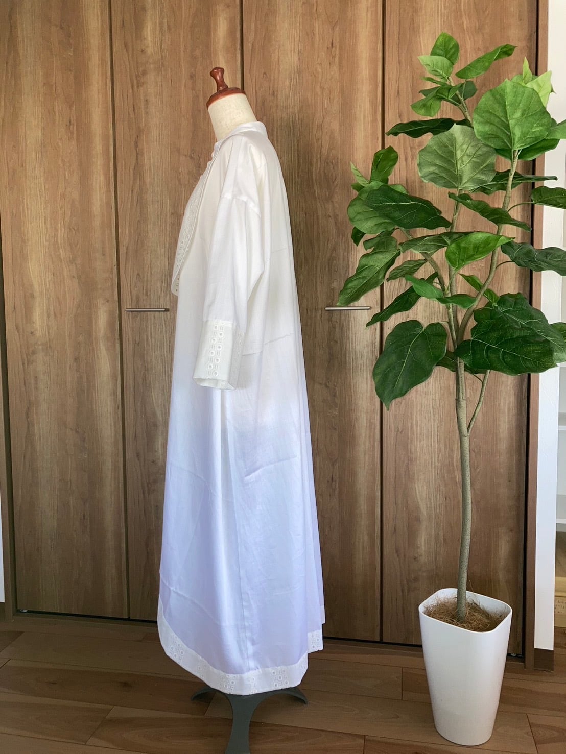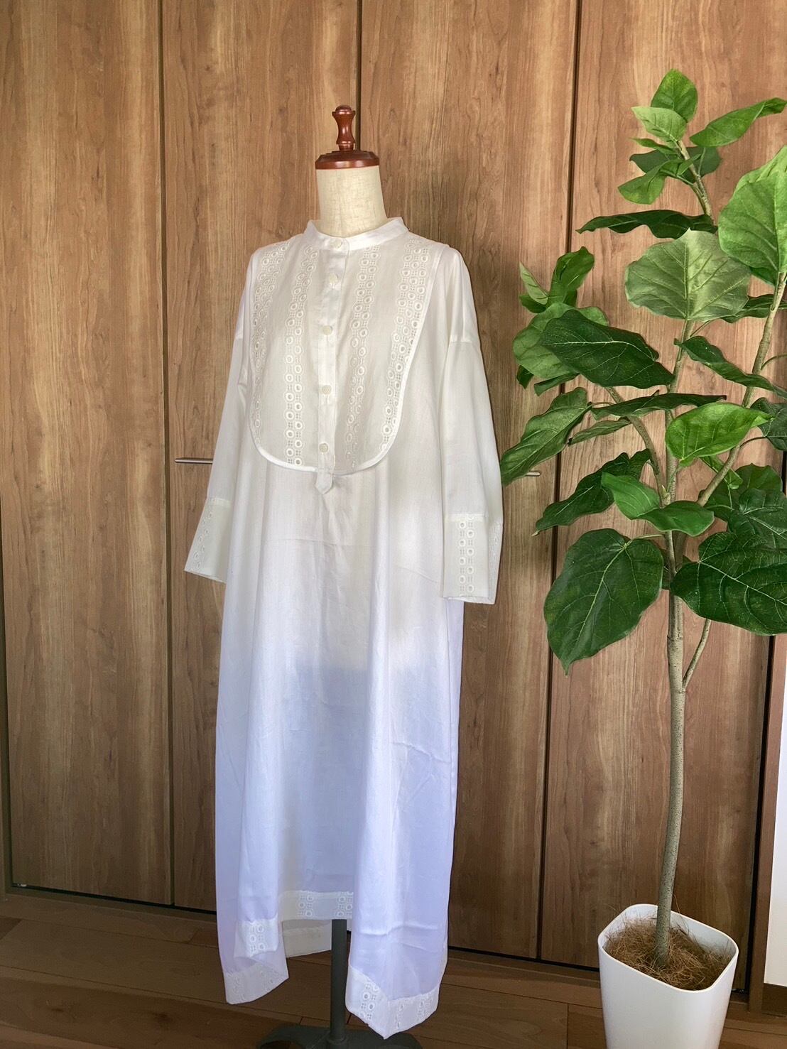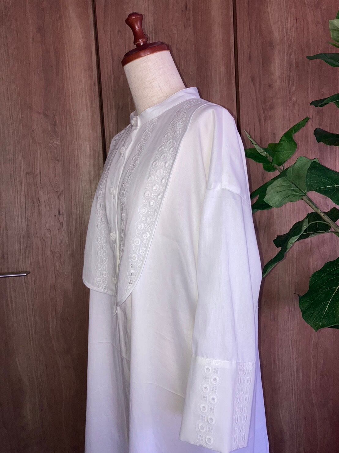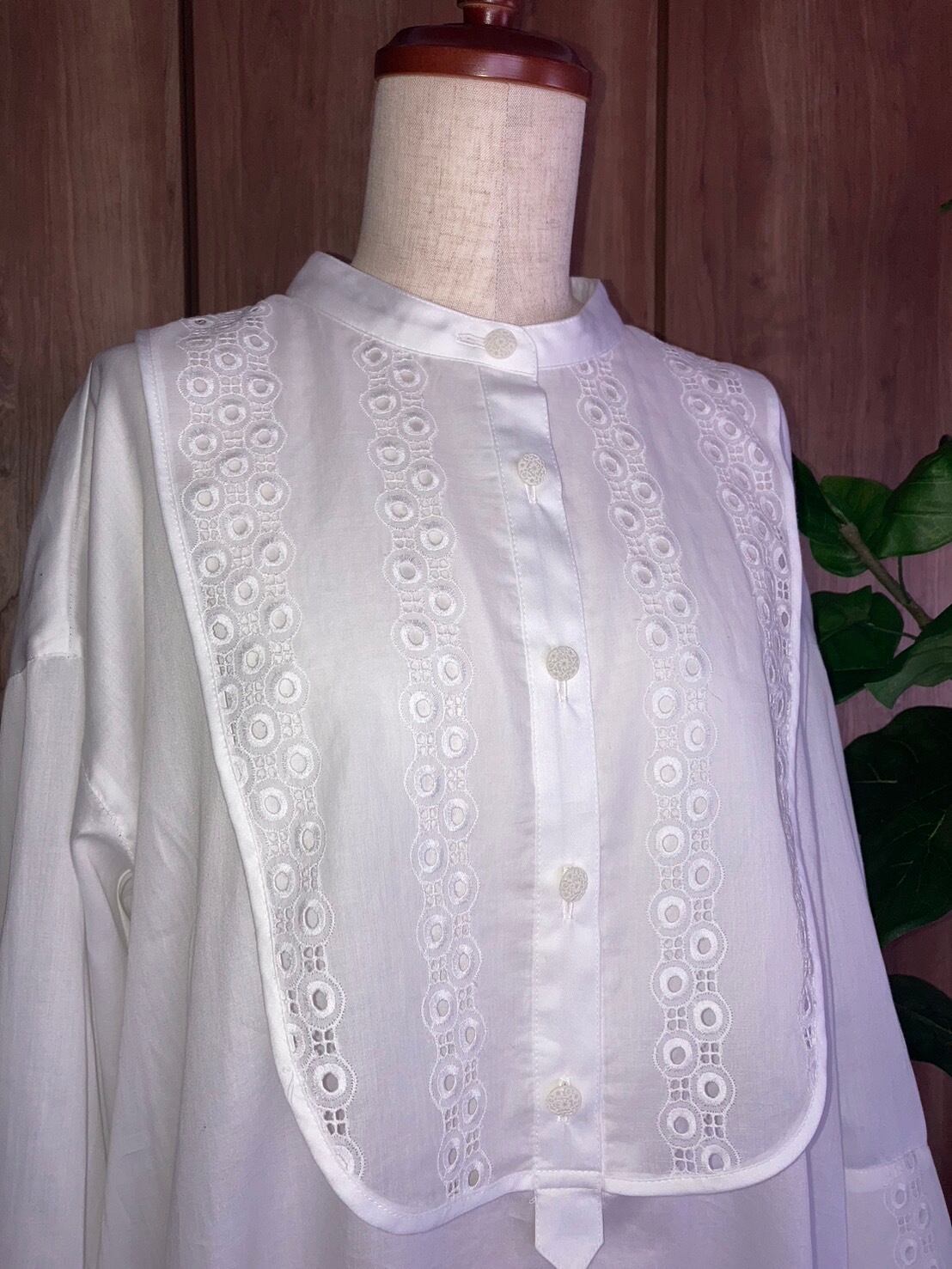 見本はストライプの柔らかい綿ローンで作っていますが、無地で作って短冊のボタンを凝った物にしてみたり、ビブヨーク、カフス、裾見返し部分の布地を変えて作るのもおすすめです。